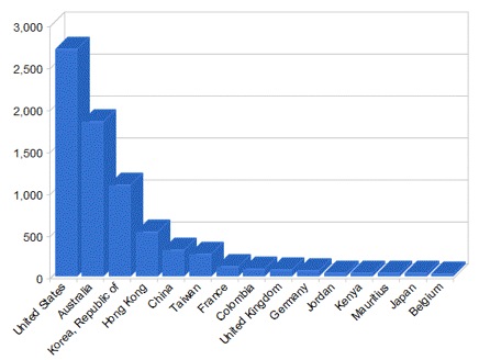 Let us look at the sources of "PHP Remote File Include" attacks. A major attack campaign was launched out of Thailand in April that caused Thailand to show up at number 1 in this list.